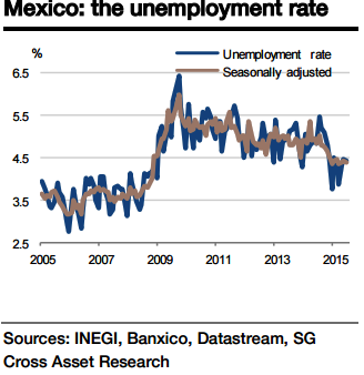 The growth slowdown in H1 led to stagnation in Mexican labour market. On a seasonally adjusted basis, the unemployment rate remained unchanged at 4.4% in Q2 compared with its Q1 value.