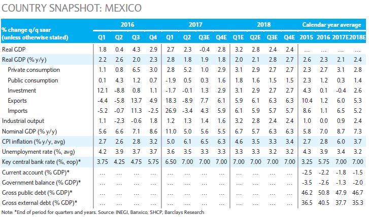 Mexico’s gross domestic product (GDP) is expected to fall by 0.45 basis point in the event of a NAFTA breakup, a possibility that has been discussed in the media recently. Long-term growth would likely decline to 2.0 percent from 2.5 percent currently. Nevertheless, a permanent real depreciation of the peso could also offset this effect, Barclays Research reported.