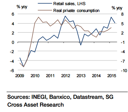 Despite Mexico's growth weakness in H1 and the visible effect of the slowdown in the labour market, retail sales on average have continued to trend up this year, in part due to the low base effect in H1 2014 and partly due to lower inflation this year.