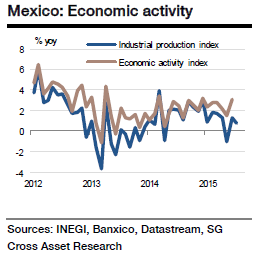 "A stronger manufacturing and trade gains is expected in Q4 15 and in 2016, boosting the rest of the economy via the investment, employment, wage and sentiment channels. Improvement in IP growth through the remainder of this year should help the economy grow to its potential in Q4 15 and then to strengthen in 2016. Currently, we expect the Mexican economy to grow by 2.3% in 2015 and 3.1% in 2016. However, we do recognise there are some downside risks to these numbers", estimates SocGen.
