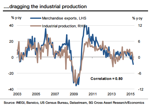 Mexican industrial production posted its first negative print (-0.94% yoy) in 13 months in May as exports fell yoy on slow demand growth in the US. As a result, we estimate growth to have slowed substantially to 0.5% yoy in May - the weakest pace since April 2014. The seasonally-adjusted series is expected to show a sequential decline of 0.9% mom and, barring a strong improvement in June, the economy looks set to slow further in Q2 after posting weak growth of 1.6% qoq (annualised) in Q1. This raises the downside risks that the economy could grow below trend in 2015 - as against our current forecast of near trend growth of 2.6%.