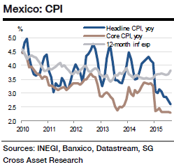 Mexico's inflation rate is expected to revert to its medium-term trend in 2016 when the base effect of lower telecom and energy prices ebb. Broadly, the inflation situation remains conducive to Banxico's current accommodative stance, and economic growth and the Fed's policy stance are likely to be the key factors in monetary policy decisions in the near term. The country's inflation rate is likely at 2.9% in 2015 and 3.5% in 2016, says Societe Generale.