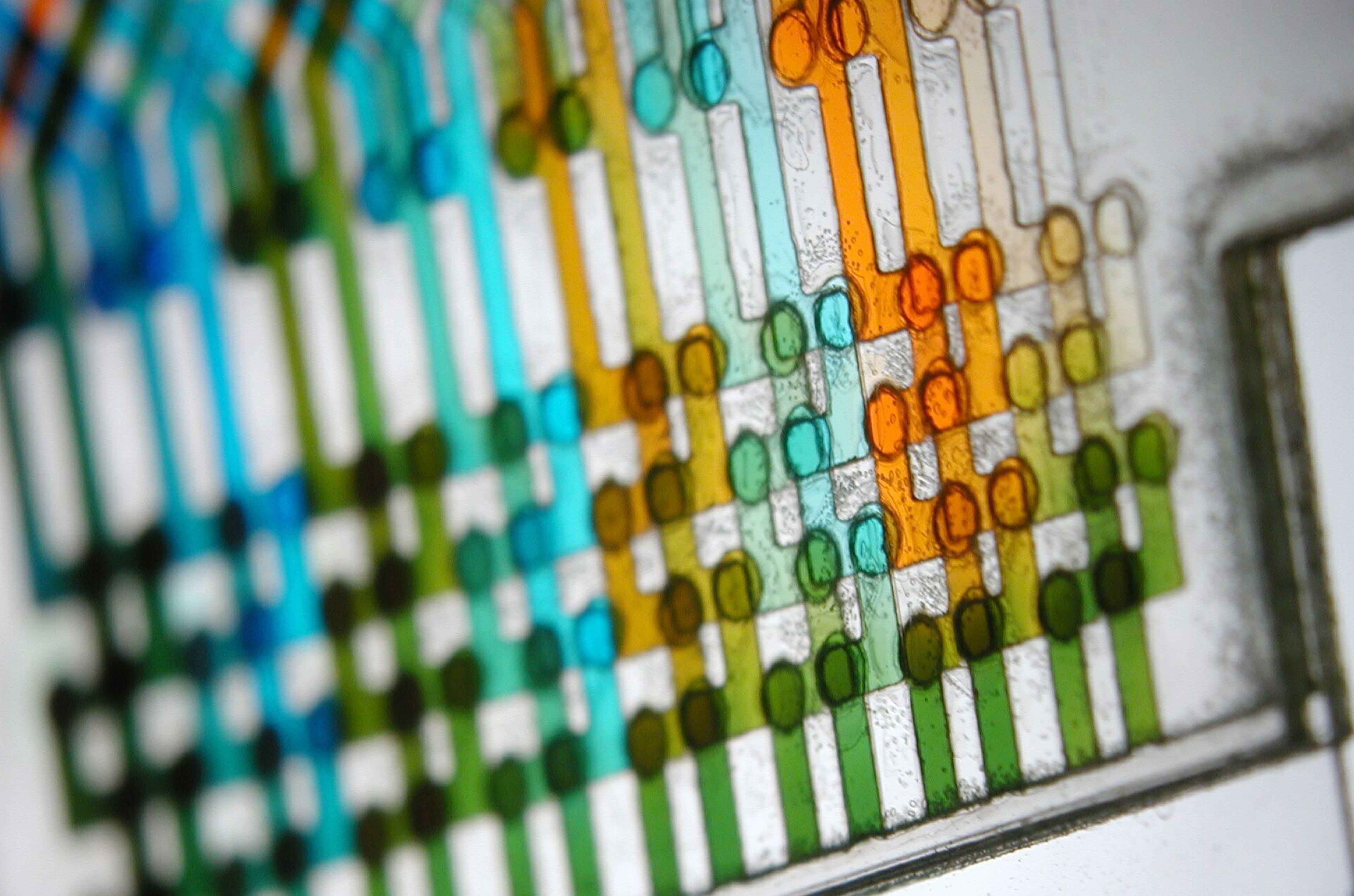 The colored liquids enter from the bottom left, but due to laminar flow, remain relatively unmixed even though they pass through one single channel and exit on the top right. Greg Cooksey and Albert Folch
