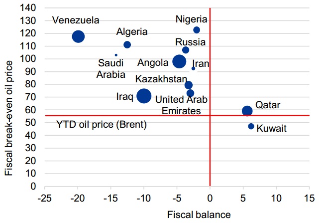 - Budgetary break even for Saudi Arabia is above $100/barrel, while for Iran it stands above $90. Kuwait has the lowest fiscal breakeven below $50/barrel, followed by Qatar at $60/barrel. Details are presented graphically.