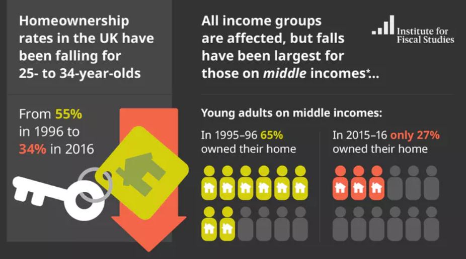The most significant decline has been for middle-income young people, whose rate of home ownership has fallen from 65% in 1995/6 to 27% now – most significantly hitting aspirant buyers in London and the South-East.