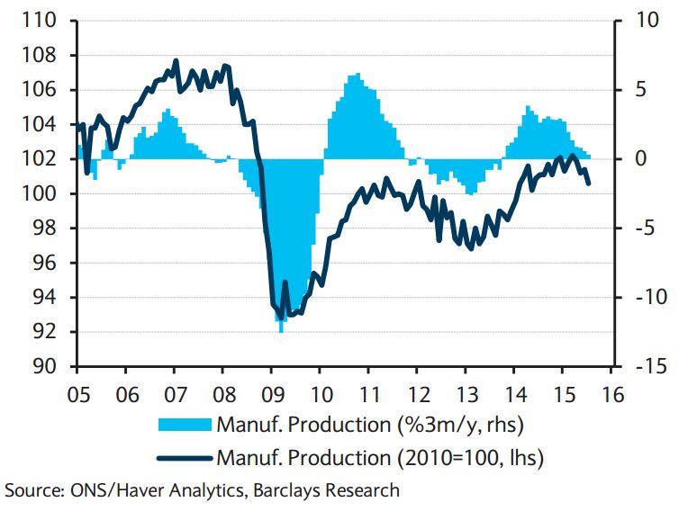 UK industrial production fell for the second consecutive month (-0.4% m/m, 0.8% y/y in July after -0.4% m/m, 1.5% y/y in June), while manufacturing registered a significant downward surprise (-0.8% m/m, -0.5% y/y in July after 0.2% m/m, 0.5% y/y in July). This weaker-than-expected print was echoed by the EEF Q3 Outlook Report in which the EEF, the manufacturing representative body, more than halved its manufacturing growth forecast; at the start of the year it was at 1.7% for 2015 whereas now it is at 0.7%. Of particular concern is the significant drop in investment goods, which has begun to show trend weakness, and the potential spill over this would have on economic activity if weakness continues. The carry over for production in Q3 is now at -0.6% q/q, its weakest since Q4 12.