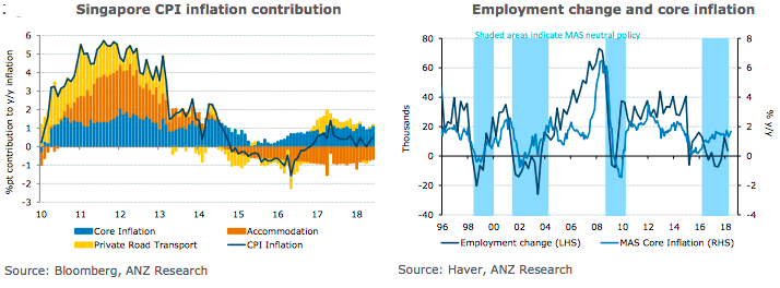 The Monetary Authority of Singapore (MAS) expects to see the county’s core consumer price inflation (CPI) to pick up towards 2 percent y/y later in the year. Based on domestic developments, a further modest tightening in October cannot be ruled out, though this will depend largely on how the external environment evolves.