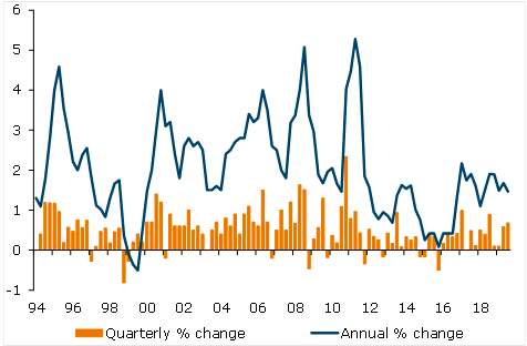 Food prices rose by 1.3 percent for the quarter, to be up 1.8 percent on a year ago. Meat prices were boosted by the African Swine Fever outbreak in China, which has squeezed global supplies of pork and created extra demand for other proteins.