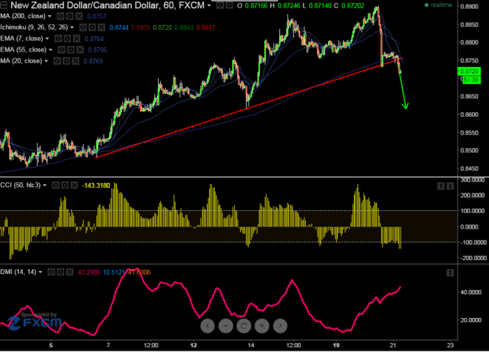 NZD/CAD has broken major trend line support 0.8750 (trend line joining 0.8480 and 0.8616) after diary prices has fallen for the first time in five months in GlobalDairyTrade platform.