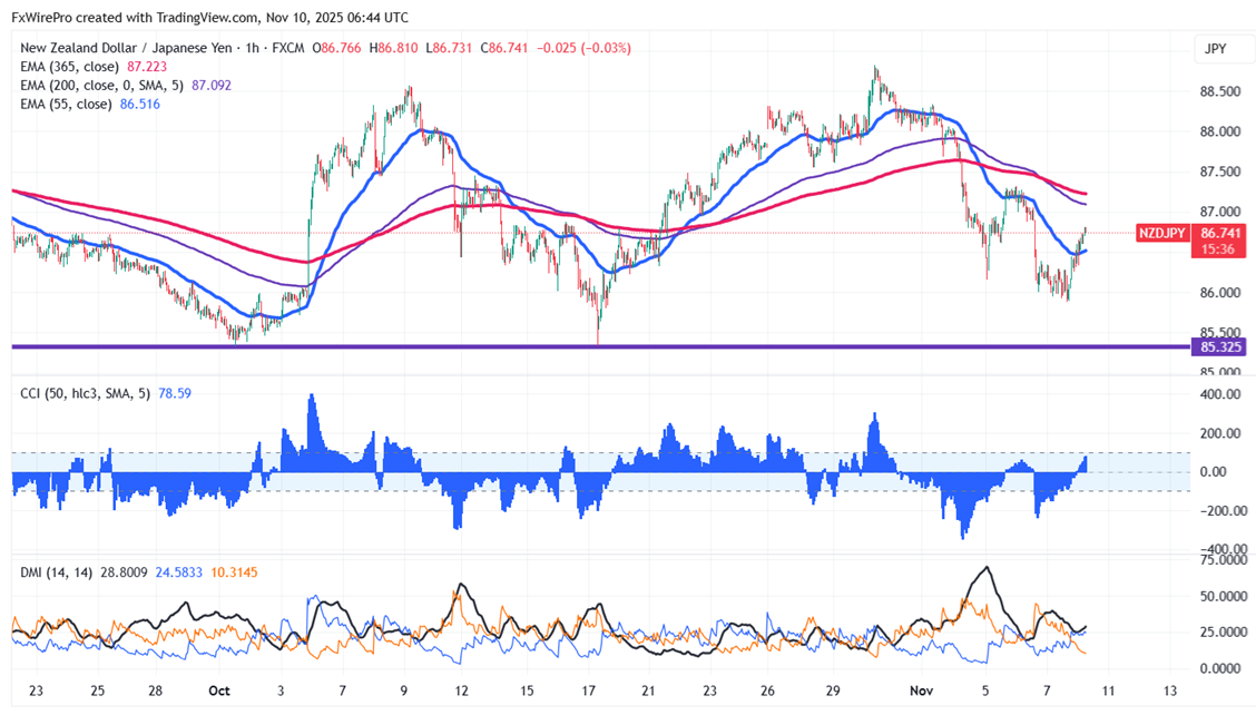 NZDJPY gained nearly 90 pips on board-based yen selling. The intraday trend is bearish as long as support at 85.80 holds. Having reached an intraday high of 86.76, it now trades around 86.776.