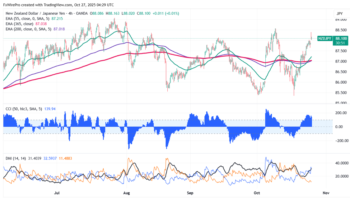 On board-based yen selling, NZDJPY rises above the 88 level. The intraday trend is bullish as long as support at 86.95 holds. Having reached an intraday high of 88.39, it now trades around 88.09. If pair trades fall under 89.20, the general trend is still terrible.