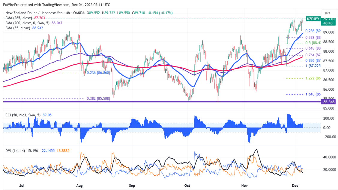 NZDJPY breaks significant resistance at 89.65 after a long consolidation. As long as support at 89 persists, the intraday trend is bullish. The pair hit an intraday high of 89.68; it currently trades at about 89..