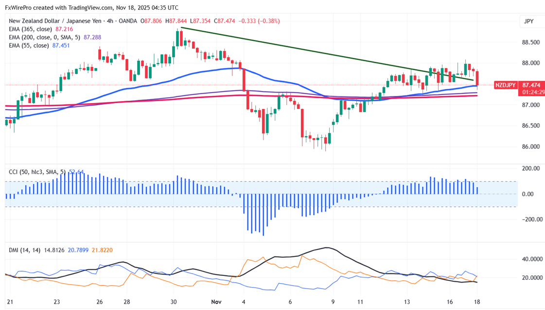 NZDJPY pared some of its gains on a weak New Zealand dollar. The intraday trend is bullish as long as support at 87.20 holds. Having dipped to an intraday low of 87.35, it now trades at about 87.39.