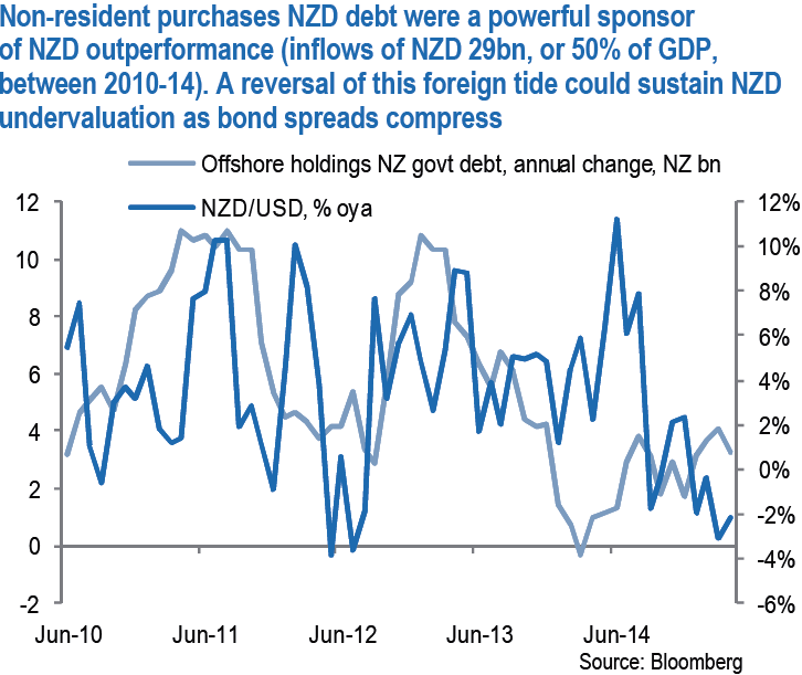 One technical factor that could help sustain the downtrend in NZD over and beyond a further repricing of monetary policy is a potential turning of the foreign bond investor tide. Non-residents increased their holdings of NZ government debt by NZD 29bn between 2011 and 2014, equivalent to 50% of GDP, an inflow which explained part of NZD's substantial cyclical overvaluation.