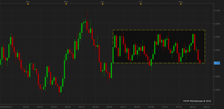 Natural gas has been trading in tight range since June. Support is lying around $2.7/mmbtu and resistance at $2.95/mmbtu.