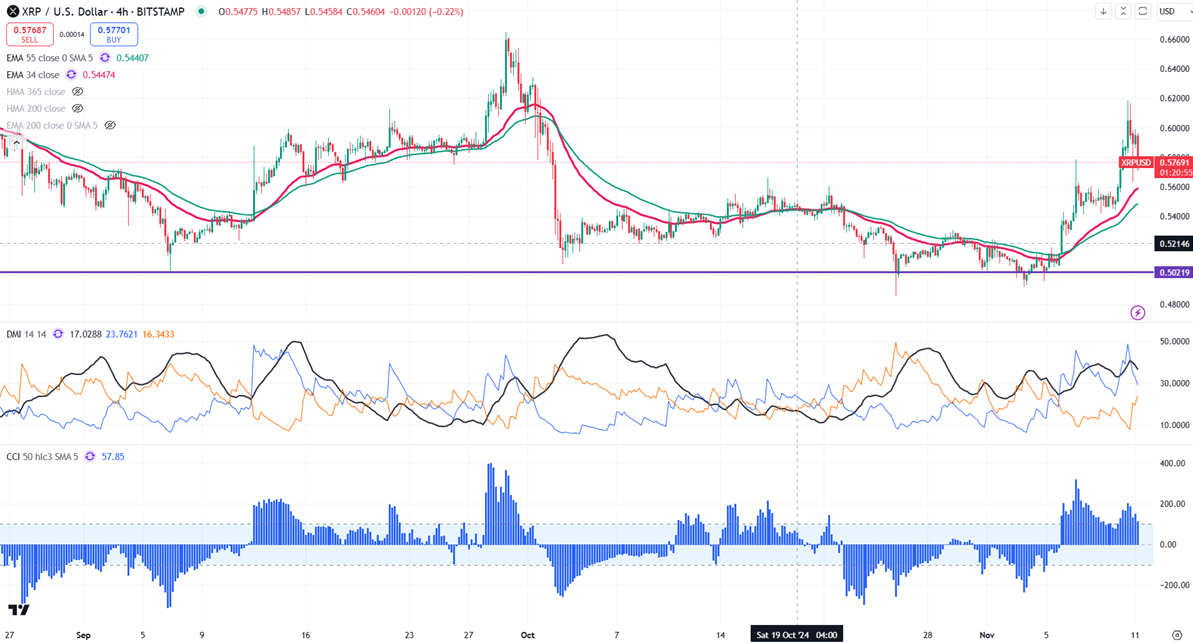 The pair is trading above both short-term (34 EMA and 55 EMA) and long-term moving averages (200-day EMA) on the 4-hour chart.