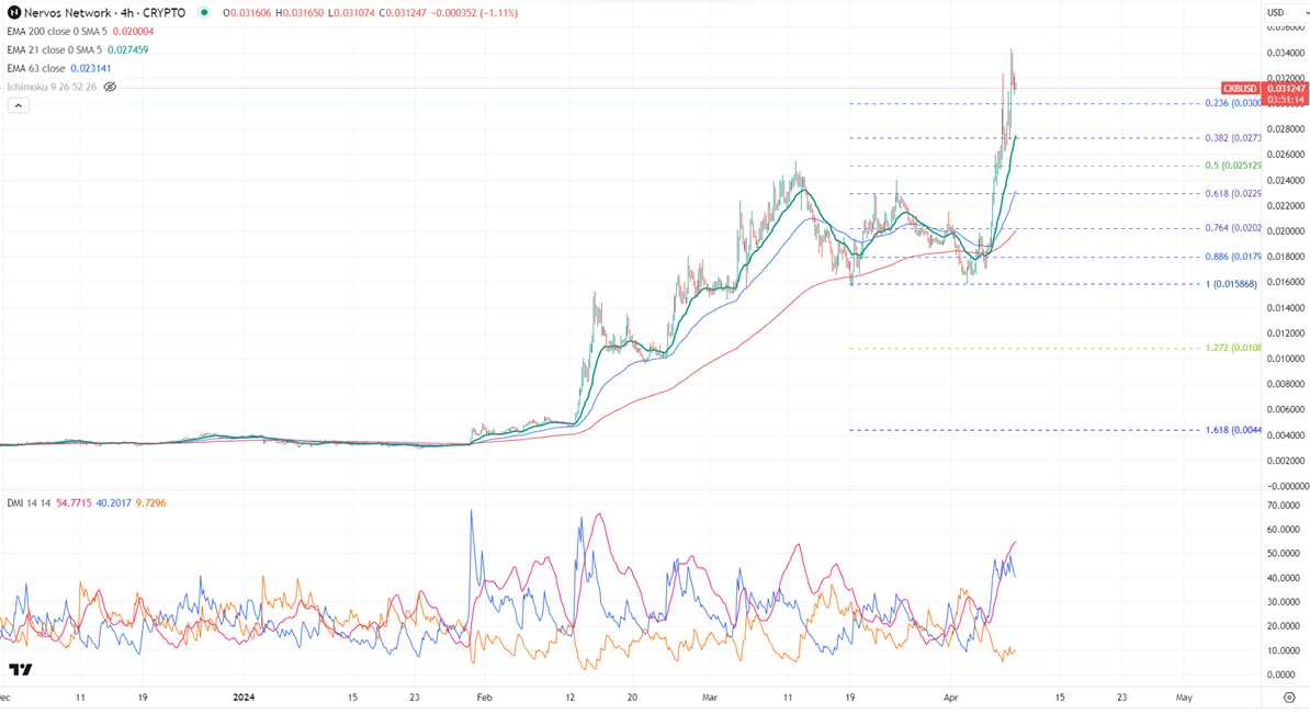 CKBUSD prices have surged more than 100% in this month. It hit a high of $0.03420 and is currently trading around $0.031563. The pair is holding above the short-term (21 and 55-day EMA) and above the long-term moving average (200-day EMA).