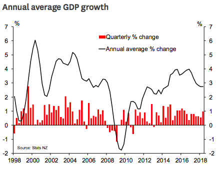The New Zealand economy fared substantially better in the June quarter, with a 1 percent rise in GDP following gains of 0.5- 0.6 percent in each of the previous three quarters. Growth is still some way off the peaks seen in 2015-16, when the economy regularly grew by 1 percent or more each quarter.