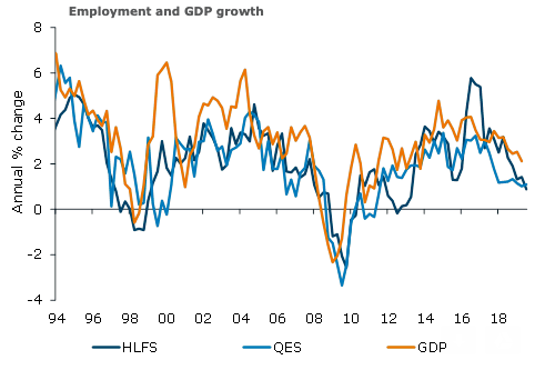 Employment growth in Q3 was weak, following solid growth the previous quarter. Growth in HLFS employment (a survey of households) was up 0.2 percent q/q. Annual employment growth dropped to 0.9 percent y/y from 1.4 percent, consistent with the weakness seen in job ads and surveyed hiring intentions. The participation rate ticked up slightly to 70.4 percent, close to its historically high level.