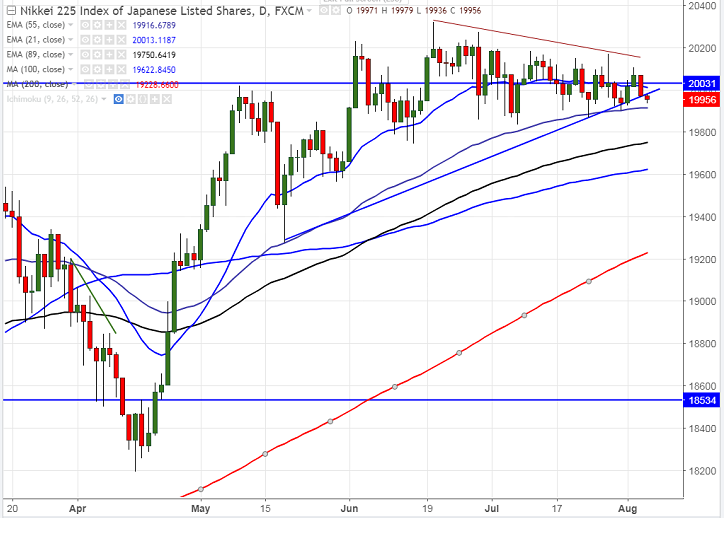 - The near term resistance of Nikkei is around 20400 (trend line joining 20230 and 20319) and break above will take the index to 20477 (161.8% retracement of 20019 and 19277) /20530 (161.8% retracement of 20220 and 19744)/20649 (161.8% retracement of 19698 and 18193).