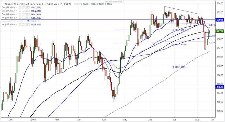 - The near term resistance of Nikkei is around 19866 (55- day EMA) and break above will take the index to 20000/20319 (Jun 20th 2017).Short term bullish invalidation only below 19275.