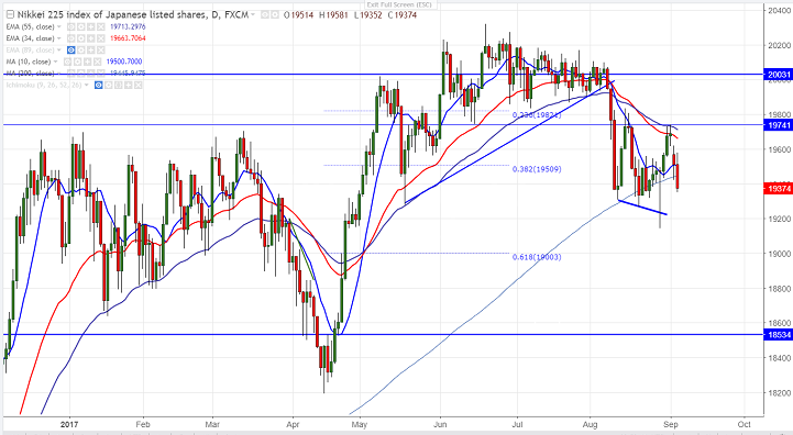 - Nikkei has shown gap down opening today morning on account political uncertainty in North Korea. Asian stock market has shown a sell off after North Korea tests hydrogen bomb on Sunday. North Korea on Sunday conducted its sixth and most powerful nuclear test. The demand for safe haven assets such as Gold, Swiss franc and yen increased due to this uncertainties. The index declined till 19476 and is currently trading around 19501 0.96% lower.