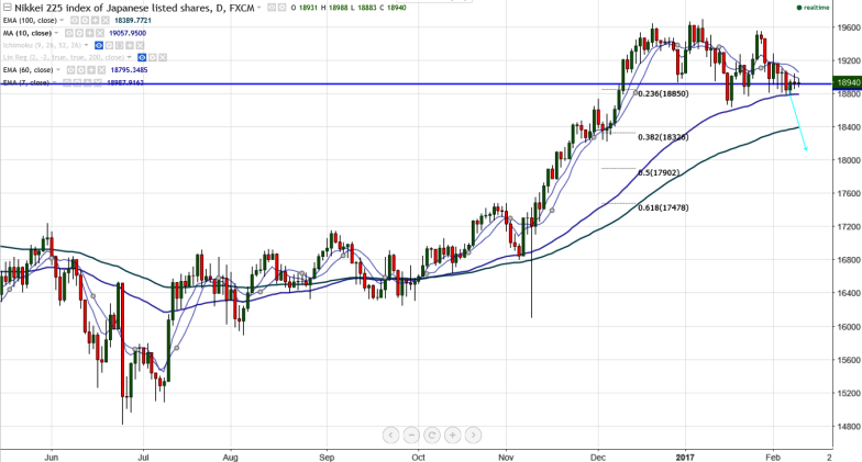 •Nikkei shown a mild jump above 19000 after making a low of 18796 but not able to hold at higher levels. The index is facing strong support at 60- day EMA and any break below confirms further weakness. It is currently trading at 18948.