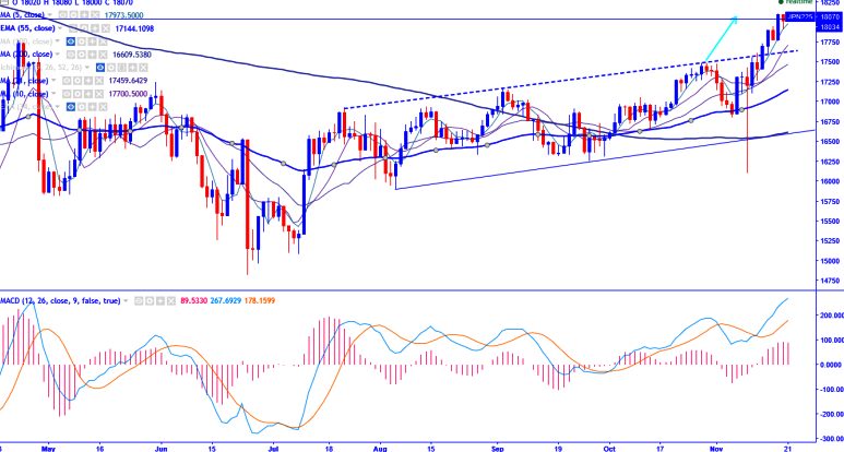 •Nikkei225 trades higher on account of weaker yen and closed slightly above 18000. The index has made a high of 18107 on 17th Nov and is currently trading at 18070 0.28% higher.