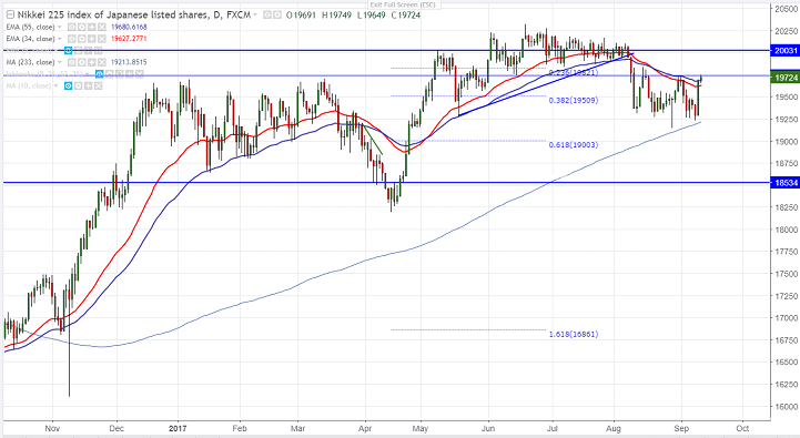- Nikkei hits 1- week high at 19749 at the time of writing on account of slight weak yen and easing North Korea tension. The index jumped almost 500 points from the low and it is trading around 19724 0.17% higher.