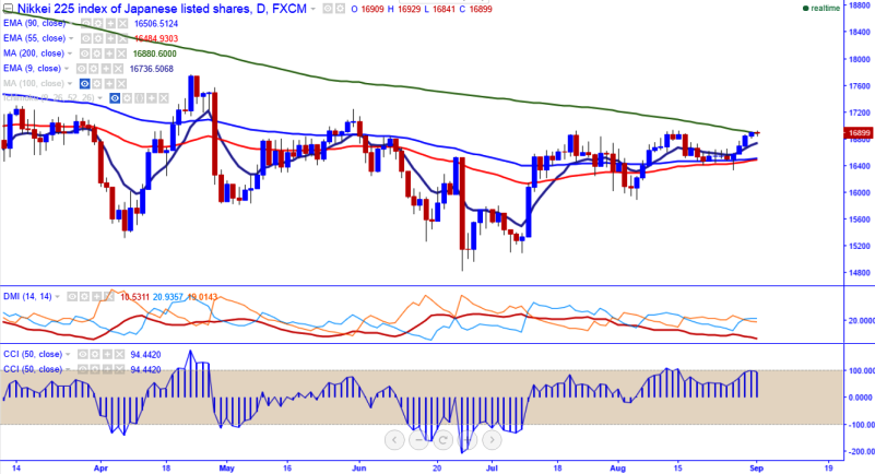 - Nikkei225 has closed at two week high yesterday on account of weaker yen. The index jumped till 16914 and closed at 16904.It is currently trading around 16909.