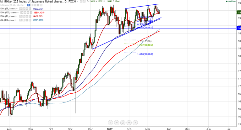 Nikkei has shown a temporary top around 19700 at Mar 14th 2017 and declining continuously from that level. It is currently trading at 19446 0.1% higher.