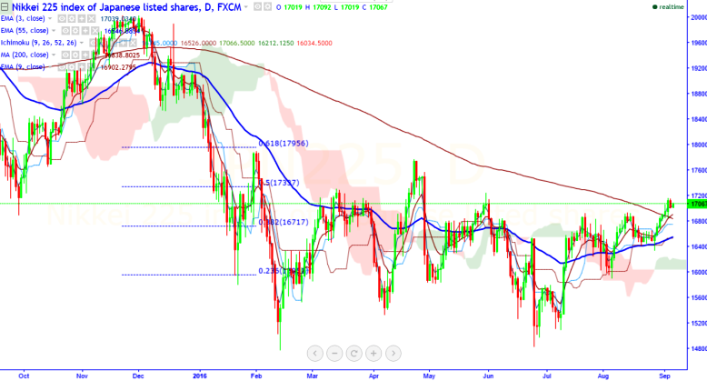 - Nikkei225 has formed a temporary top around 17159 and declined till 16999 yesterday.It is currently trading around 17059.