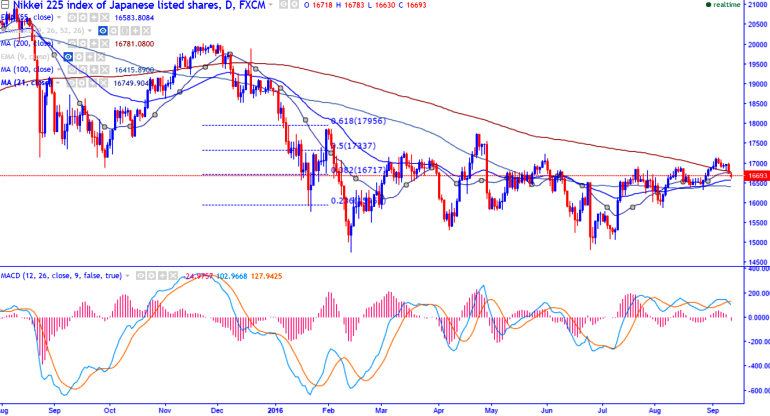 - Nikkei225 has broken major support at 200- day MA at 16796 and trades slightly below that level.It is currently trading around 16693.