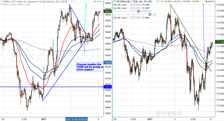 - Nikkei225 has once again recovered sharply after jumping till 19413.The slight decline in yen has made index to jump till 19623 . It is currently trading around 19618 0.03% higher.