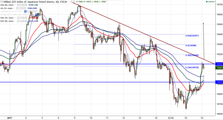 Nikkei225 declined till 18648 yesterday and jumped slightly from the lower level on account of slight weakness in the yen. It is currently trading around 19063 0.24% higher.
