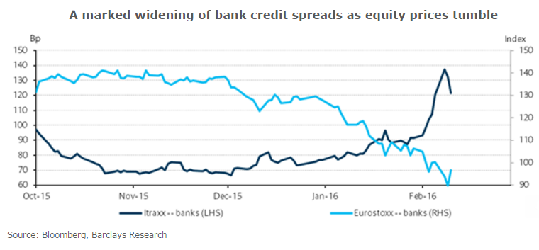 European banks' credit and equity are at levels not seen since 2012-13. The 2008-09 financial crisis and the negative impact on the banking sector has created a significant level of non-performing assets. Despite provisions and capital buffers being raised, the ratio of non-performing loans to capital remains elevated. Also growing concerns about the strength of the business (and credit) cycle in the past few weeks have created a sharp widening in bank credit spreads.