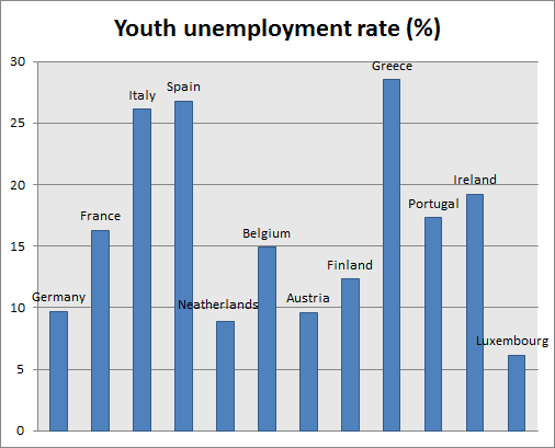 - Unemployment is at staggering high in most of the countries especially among youth. Greece leads with 28 percent whereas Luxemburg has the lowest at 6 percent. Even the second largest economy France has above 15 percent. The numbers exclude those doing studies or course or training.
