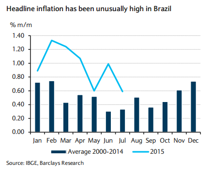 The recent inflation prints in Brazil surprised on the upside, as food prices seasonally experience a decrease between the months of May and July, driving headline inflation lower. This year, however, food prices' monthly increases average 0.97%, according to the IPCA- 15 inflation print released this week. This compares with an average of 0.35% in the same months of last year and 0.19% for that period in 2013. That said, the monthly headline IPCA-15 inflation averaged 0.73% in the past three months, in contrast to 0.41% in the same period in 2014 and 0.30% two years ago. That said, the y/y IPCA-15 released this week moved up to 9.25% from 8.80% in June.