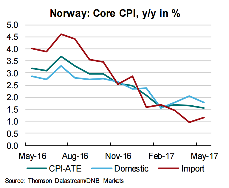 Economic data out of Norway has been mixed during the last weeks. Improvement was seen in capacity utilization and unemployment fell, while inflation remained below Norges Bank’s projection from March. Registered unemployment (unadjusted) fell 0.2 percentage points to 2.6 percent in May.