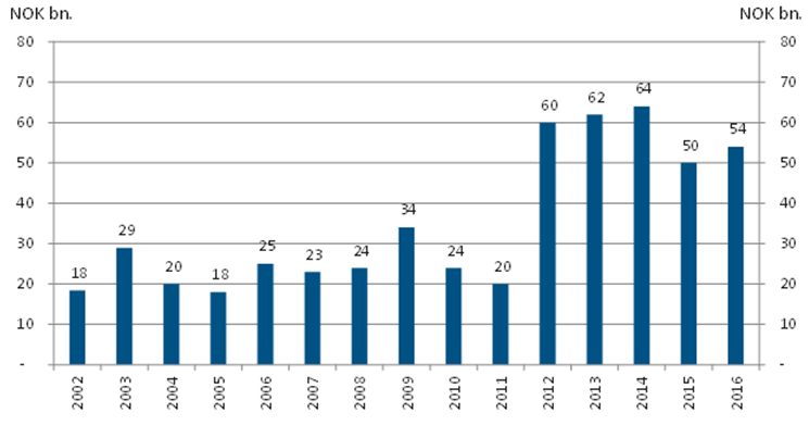 "With a issuance of NOK 54bn the government maintains the relative high issuance volume over the previous years. We had expected a lower issuance volume as the underlying funding need is plummeting. The underlying funding need from the various lending schemes is reduced by 26bn from 2015 to 2016 to 10bn. This is mainly due to an over 20bp drop in net lending to mortgages for public employees", says Nordea Bank.