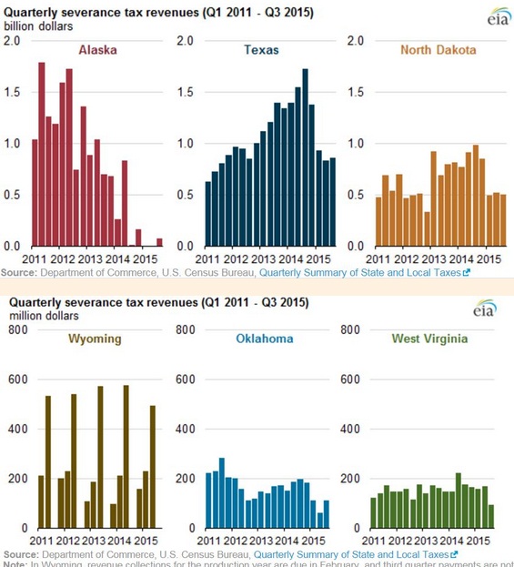 Drop in oil prices, likely to lead these States either on the verge of bankruptcy or serious austerity. For Alaska, severance taxes have fallen from billions of Dollars per quarter to just few millions in 2015. Texas has much more diverse source of tax revenue but revenue from oil dropped around 50%, undoubtedly adding pressure. For North Dakota, severance tax revenue dropped from some $3.5 billion in 2014 to $2 billion in 2015.