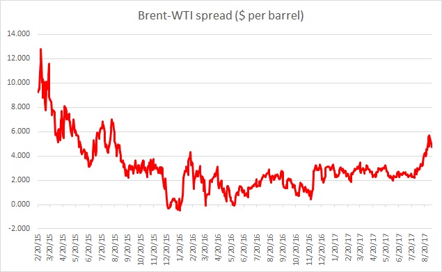 The spread between two most widely used oil benchmarks, North American WTI and North Sea Brent is easing after it reached the highest level in 24 months thanks to the disaster caused by Hurricane Harvey last week that led to closure of all ports in the Gulf Coast and led to Refining capacity shut down in the tune of 4.9 million barrels per day. Last week, the spread reached as high as $5.8 per barrel, which is the highest level since August 2015. WTI, which was a big loser last week as oil produced in the United States remained land locked, away from refineries, is slowly gaining grounds, while Brent has lost some of its shine. WTI is currently trading at $48 per barrel and the spread is at $4.7 per barrel.