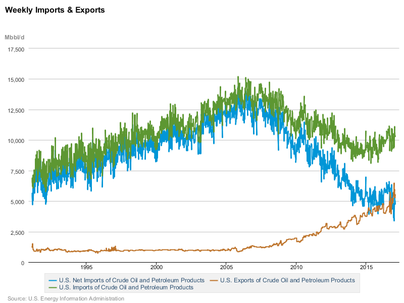 - The net imports of crude oil and petroleum products have declined from 15.1 million barrels per day in 2006 to just 5 million barrels per day as of last week. We always believed that this has always been the major factor for a decline in oil price since the summer of 2014. For the same period, US crude oil and other petroleum product exports rose from just 1 million barrel per day to 5.3 million barrels per day, as of last week.