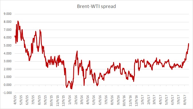 As the produced crude remains landlocked, away from refineries, the demand for WTI is in decline. The spread (Brent-WTI) reached $5.4 per barrel this week, which is the highest since August 2015.
