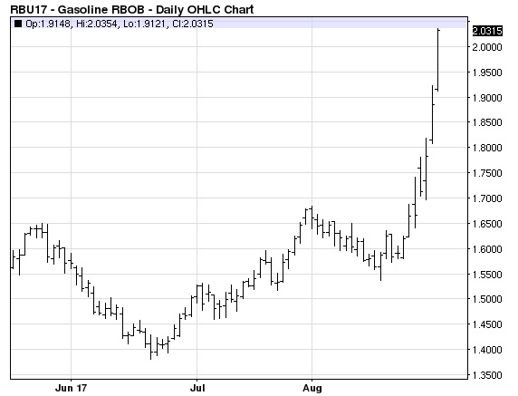 The shutting down of refineries has pushed the gasoline market to severe backwardation as the contract for September delivery breached $2 per barrel before expiry. The contract for September delivery traded as high as $2.03 per gallon, while the contract for October delivery reached $1.67 per gallon, pointing to a $0.36 per gallon backwardation. The market is in backwardation until March 2018, which contract is trading at $1.48 per gallon.