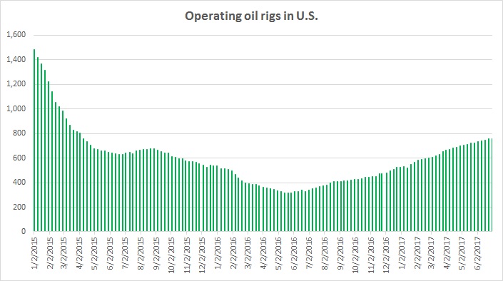 The report from Baker Hughes shows that the numbers of operating rigs in the United States declined for the first time in 24 weeks. In the last week, there was a decrease of 2 operating rigs in the US, pushing the total number to 756, the highest since April 2015. A separate report showed that U.S. oil producers are pumping at 9.25 million barrels per day, which is the highest level of production since August 2015, however, it has declined from a recent peak around 9.35 million barrels per day. The production has increased by 822,000 barrels per day since bottoming around last July. The International Energy Agency (IEA) recently forecasted that production is set to rise by 920,000 barrels in 2017 alone and by 780,000 barrels per day in 2018.