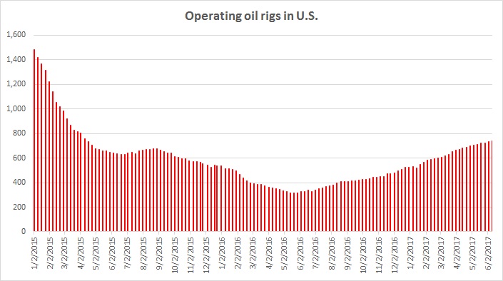 The report from Baker Hughes shows that the numbers of operating rigs in the United States rose for the 21st consecutive week. In the last week, there was an increase of 8 operating rigs in the US, pushing the total number to 741, the highest since April 2015. A separate report showed that U.S. oil producers are pumping at 9.32 million barrels per day, which is the highest level of production since August 2015. The production has increased by 890,000 barrels per day since bottoming around last July.