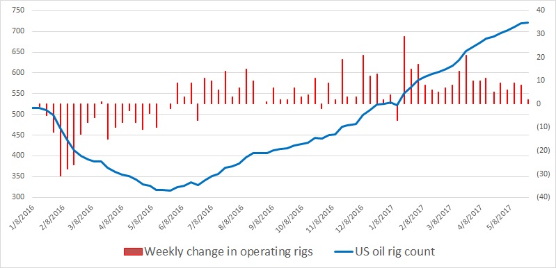 A separate report showed that US oil production has reached 9.32 million barrels per day for the week ending on 19th May, which is the highest level of production since August 2015. The production has increased by 892,000 barrels per day since bottoming around last July.