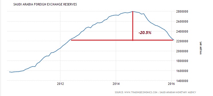Since, 2014 after reaching its peak in August, Saudi Arabia’s FX reserve declined by 20.5% according to latest data from February, 2016. It is now hovering at levels seen in 2012, around $592.7 billions. In January alone it lost close to $94 billion worth of reserves.
