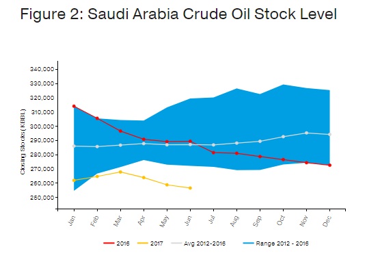 Saudi Arabia’s oil minister Khalid al-Falih said last month that the kingdom will reduce exports to just 6.6 million barrels in August, proving support to oil price. That level is almost a million barrels less than the amount exported by Kingdom a year ago. Now, the data from JODI suggests that exports are likely to decline further as the stockpiles have declined to just 257 million barrels, which is the lowest in more than five years.